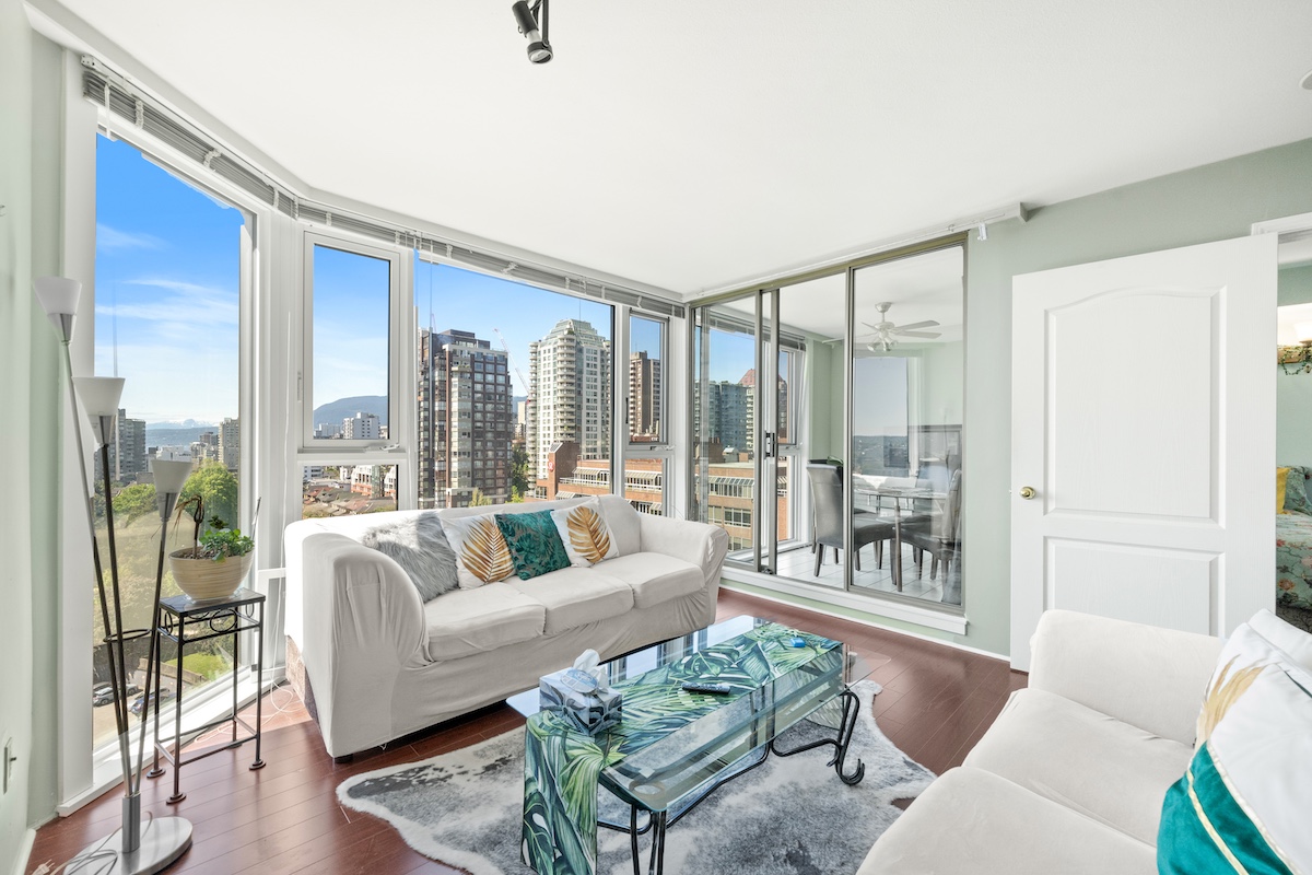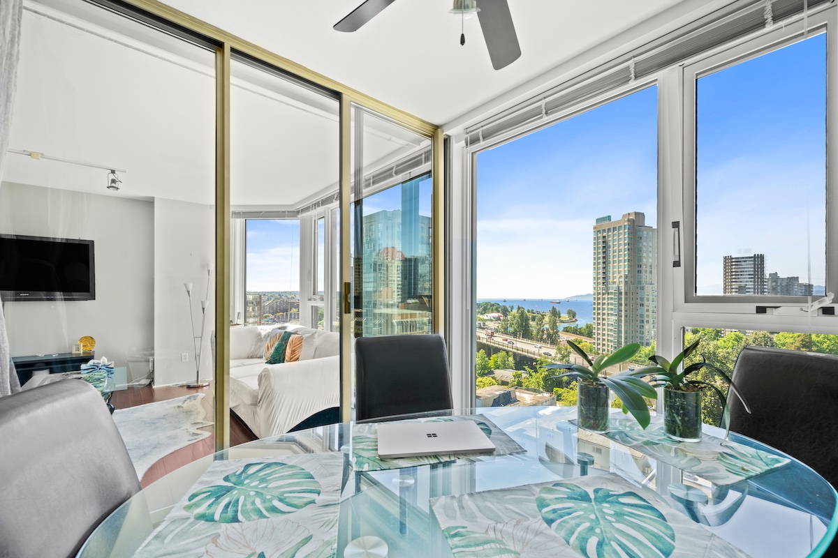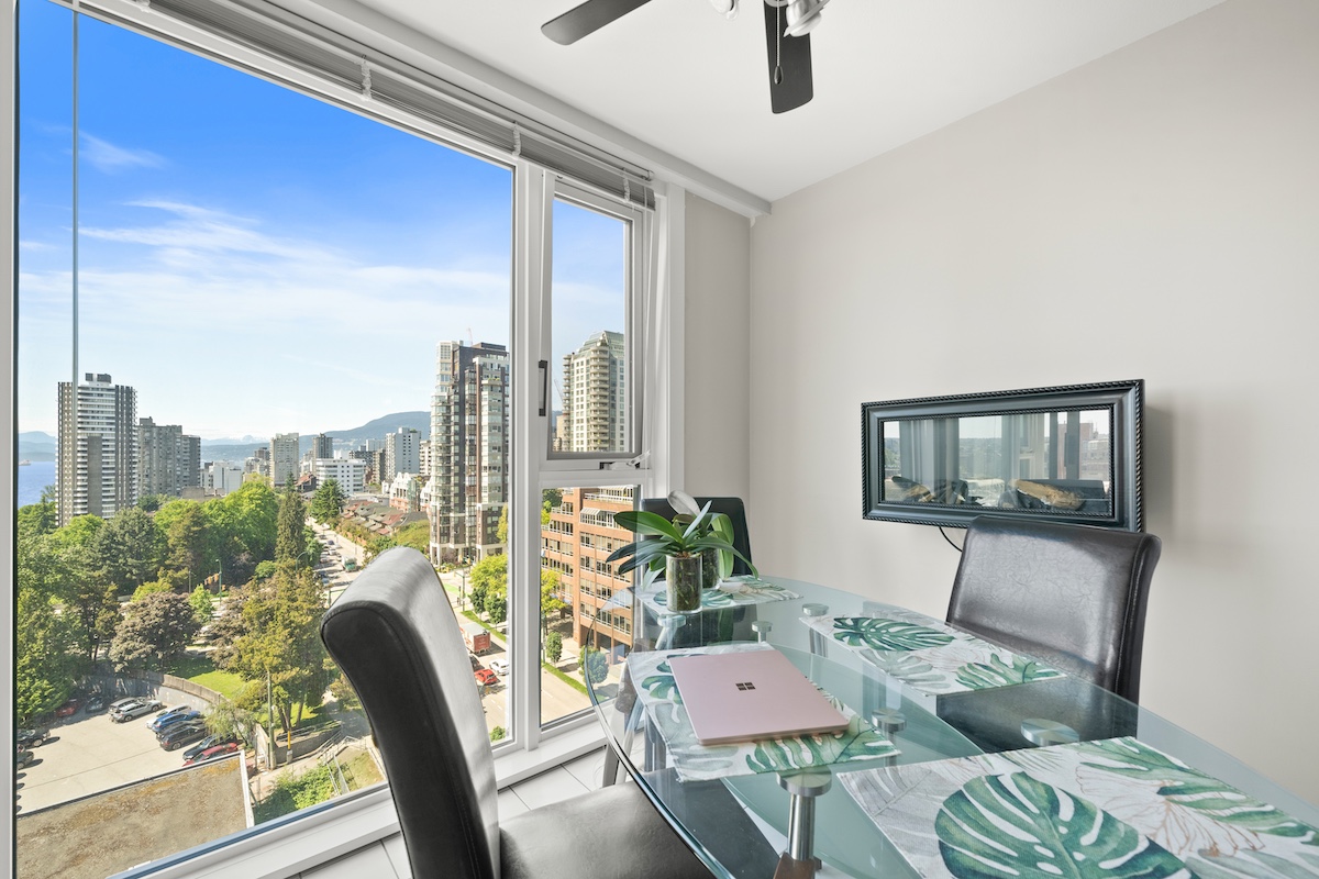Experience the epitome of sophisticated city living at Pacific Promenade with stunning English Bay views this lovely 529 Sq. Ft., 1 bedroom, solarium, 1 bathroom condo situated on the 14th floor. This fully furnished residence is move-in ready, requiring only your suitcase. The generously sized kitchen serves as a culinary sanctuary, perfect for preparing indulgent meals. The expansive living and dining area offers breathtaking views of the water and the iconic Vancouver skyline, providing an ideal setting for entertaining guests. Beyond being a mere dwelling, this home represents a lifestyle statement. Includes the convenience of one designated underground parking stall.