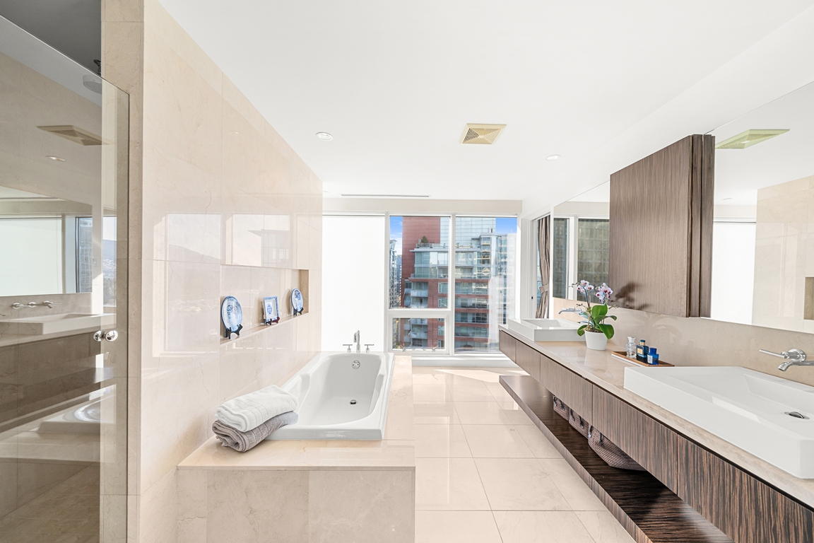 TWO HARBOUR GREEN WATERFRONT ESTATE HOME — A world-class fully furnished residence offering 3,636 sq. ft. of interior living plus nearly 300 sq. ft. of outdoor space. Features include 3 bedrooms, 3.5 bathrooms, an open floor plan, hardwood floors, an entertainer’s kitchen with Miele and Sub-Zero appliances, and a luxurious primary suite with a spa-inspired ensuite. Enjoy breathtaking 180-degree northwest water, mountain, and city views. Hotel-style amenities include 24-hour concierge, pool, spa, sauna, guest suite, virtual golf, and a private 3-car garage with storage. Ideally located near Stanley Park, the Seawall, marina, fine dining, and luxury shopping.
