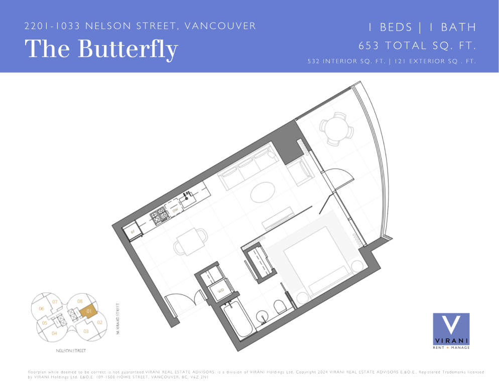 The Butterfly by Westbank, a striking new addition to downtown Vancouver’s skyline. This world-class building features 331 one-of-a-kind homes. This BRAND NEW Semi-Furnished 1-bedroom, 1-bathroom unit on 22nd floor spans 653 total Sq. Ft., with 532 Sq. Ft. of interior living and 121 sq. ft. of exterior space. The custom interior includes a eucalyptus veneered front door, large white porcelain flooring, Italian-crafted kitchen with Miele appliances. Floor-to-ceiling sheer drapery and curved glass walls enhance the light-filled space. LEED Gold certified, the building excels in energy efficiency and water conservation. Amenities include a 24-hour concierge, sky spa pool, & gym. 1 Parking Stall, 1 Storage, 1 Bicycle Storage, 1 Bike Loop
