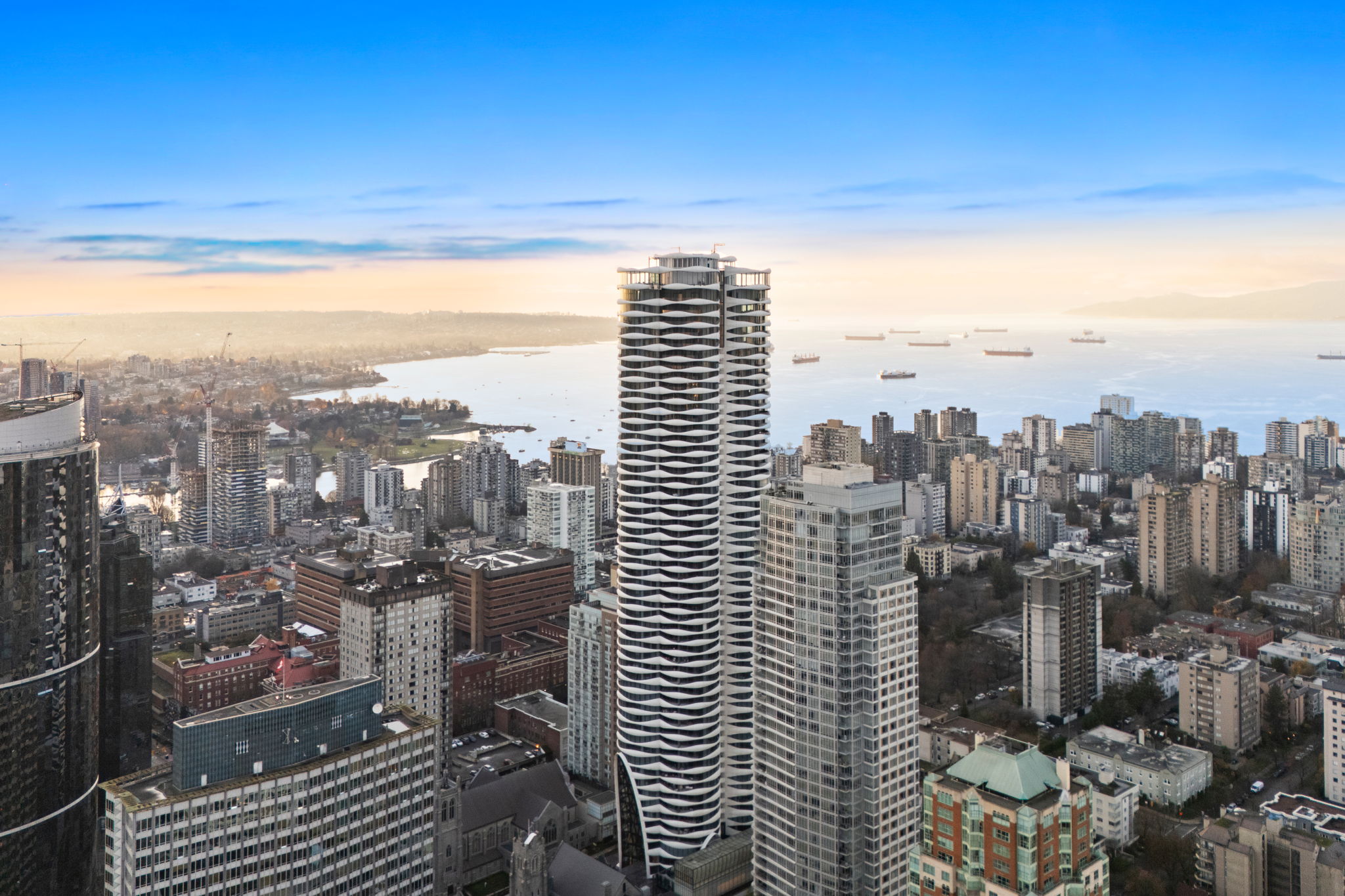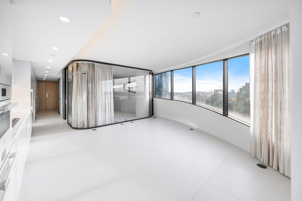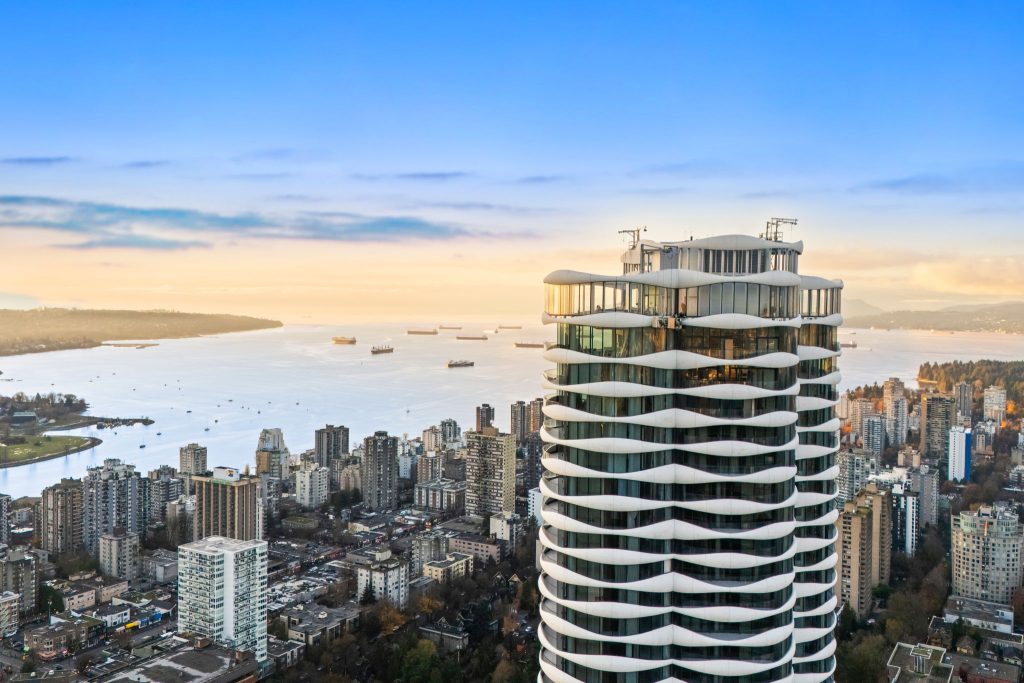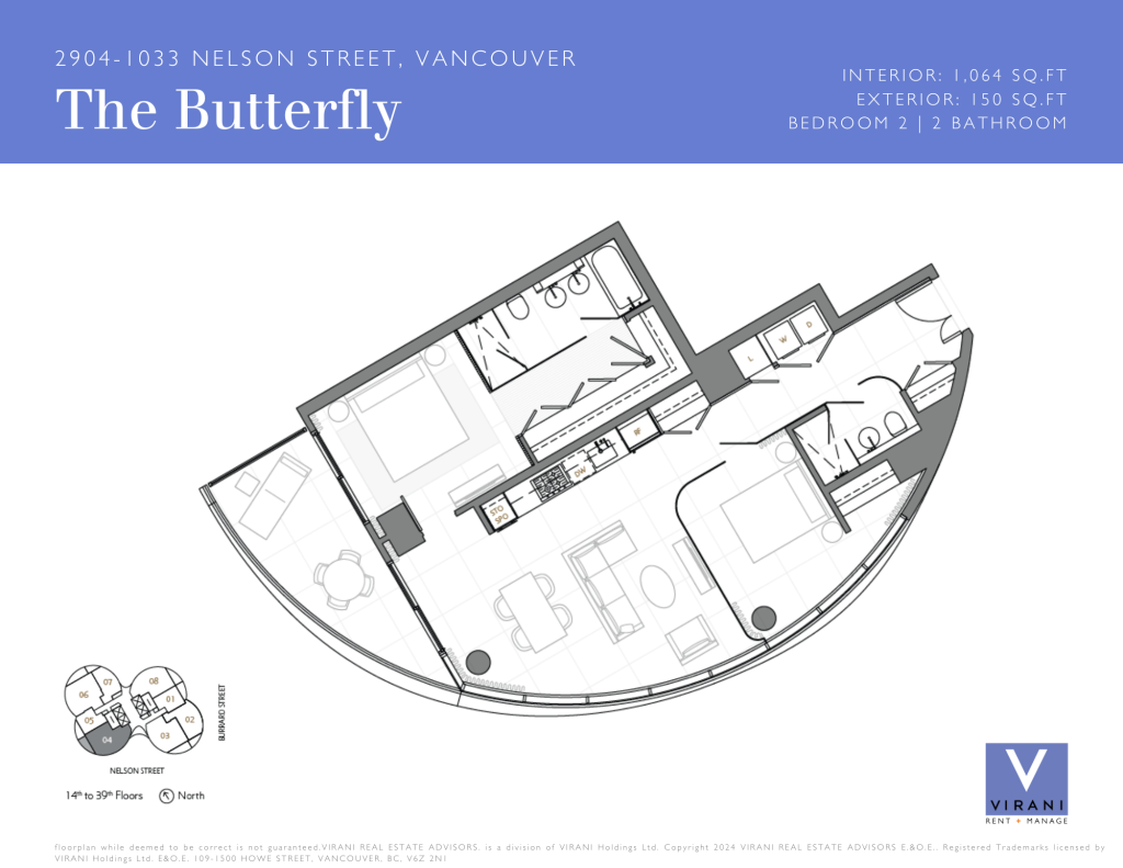 The Butterfly by Westbank, a striking new addition to downtown Vancouver’s skyline. This world-class building features 331 one-of-a-kind homes. This BRAND NEW 2-bedroom, 2-bathroom unit on 29th floor with 1,064 sq. ft. of interior living offers a luxury living in one of the iconic buildings in Vancouver. The custom interior includes a eucalyptus veneered front door, large white porcelain flooring, and an Italian-crafted kitchen with Miele appliances. Floor-to-ceiling sheer drapery and curved glass walls enhance the light-filled space. LEED Gold certified, the building excels in energy efficiency and water conservation. Amenities include a 24-hour concierge, sky spa pool, gym, and a $1 million Fazioli piano. 1 Parking Stall, 1 Storage, 1 Bicycle Loop.
