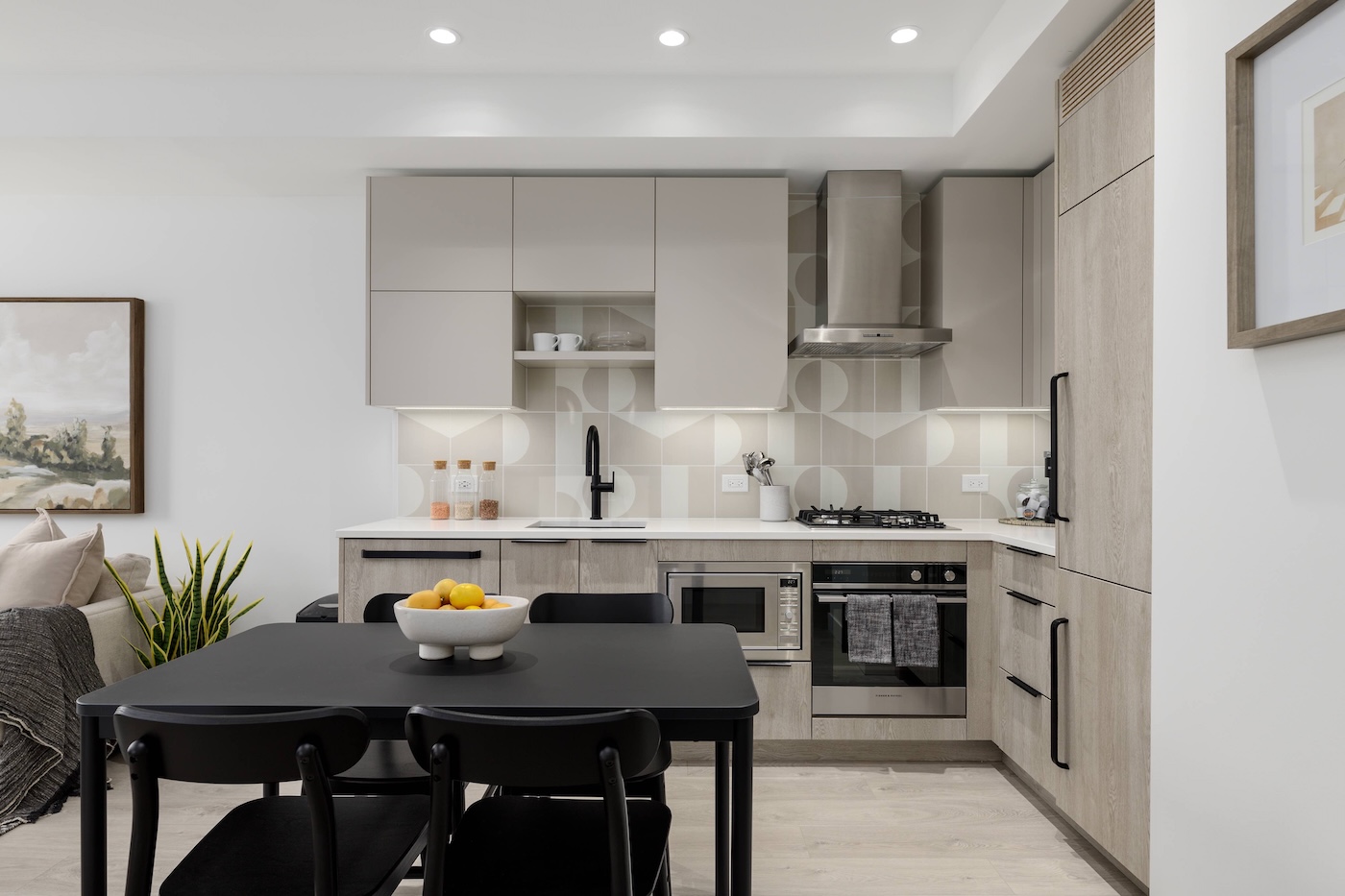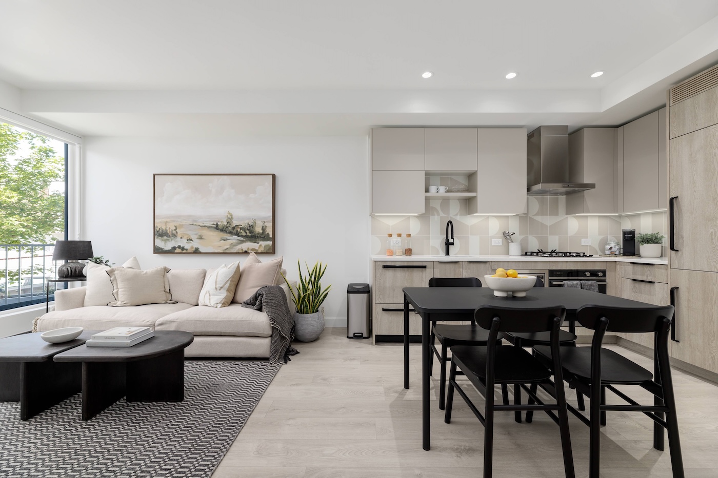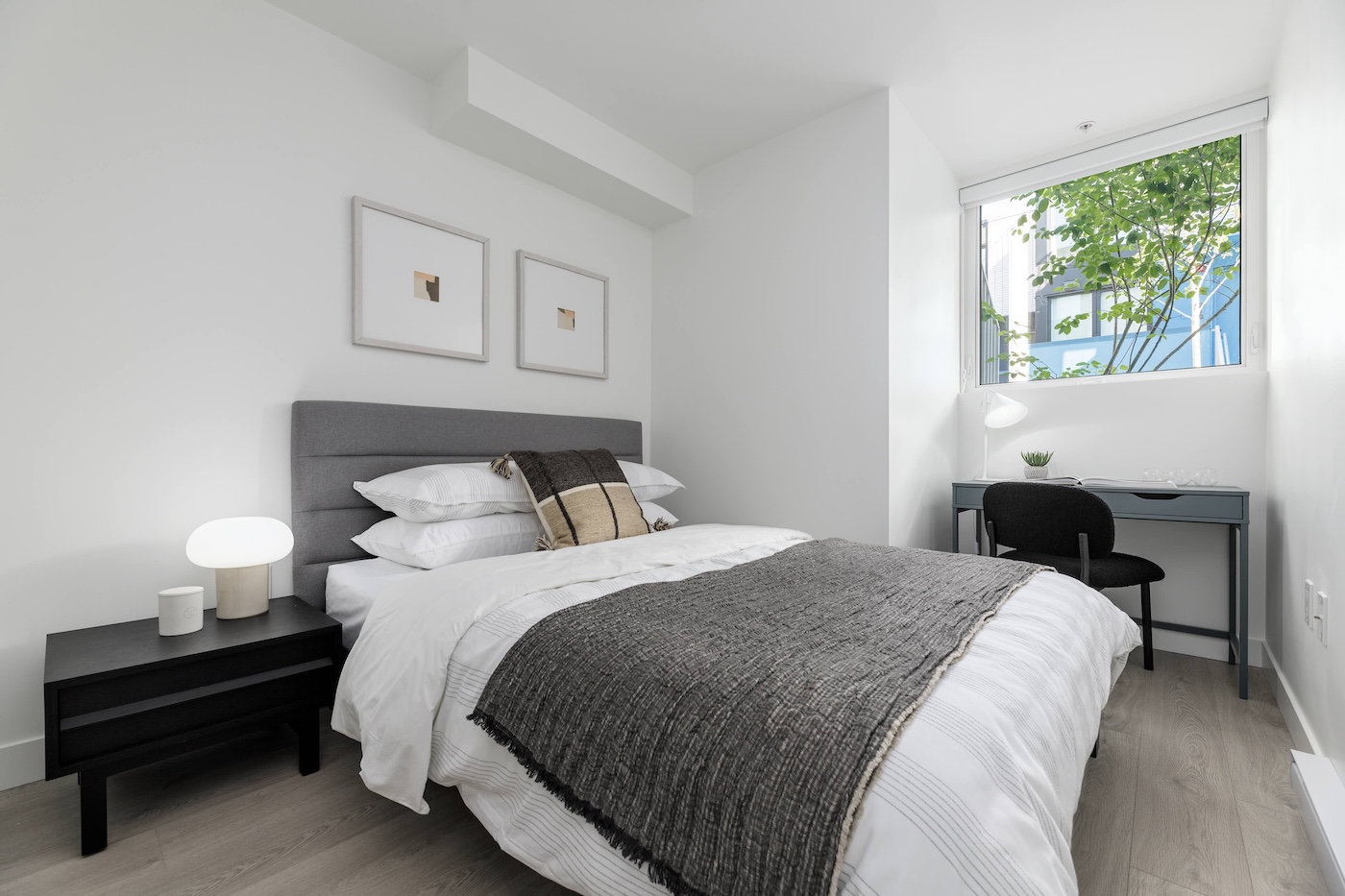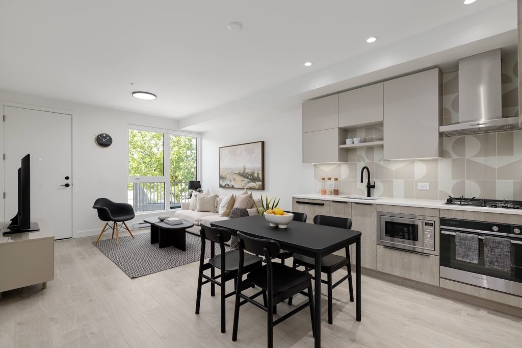 E15 JUST OFF MAIN by OpenForm Winner of the UDI Award for Excellence in Ground-Oriented Housing 2024. This modern, furnished or unfurnished 1-bed + den, 1-bath home, designed by MA+HG Architects, features interiors by Cristina Oberti with large windows that flood the space with natural light. The kitchen includes a gas cooktop, Fisher & Paykel appliances, and ample storage. The unit also boasts hardwood floors, stylish black fixtures in the washroom and kitchen, and art by Scott Sueme on the exterior. Located just steps from Main Street and minutes from downtown, E15 blends modern design with a creative edge. Ready to move in and make it your own!