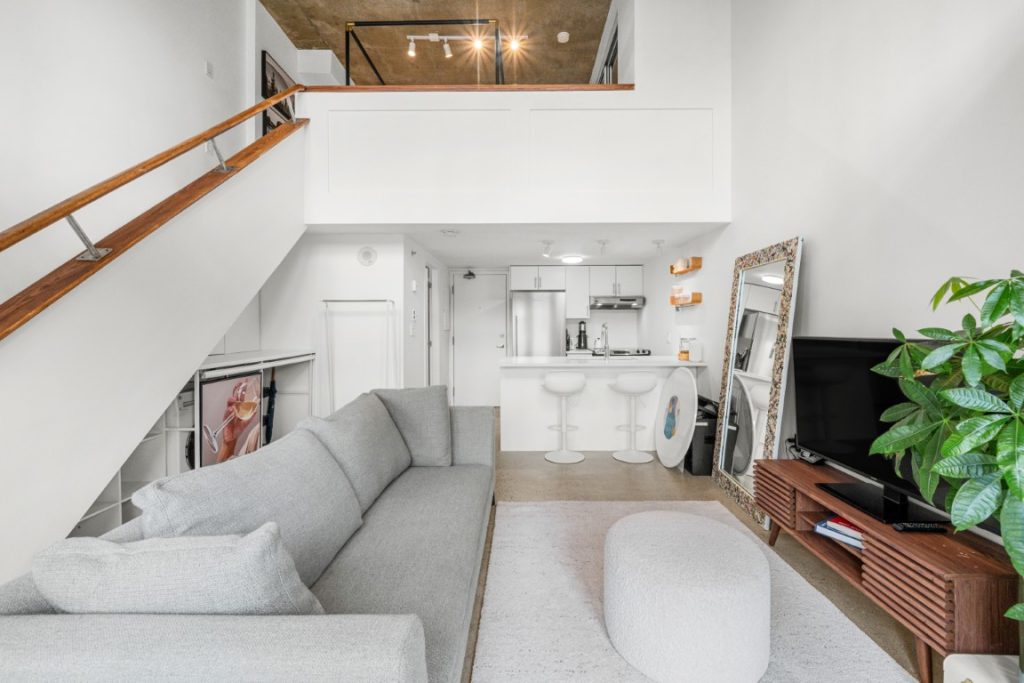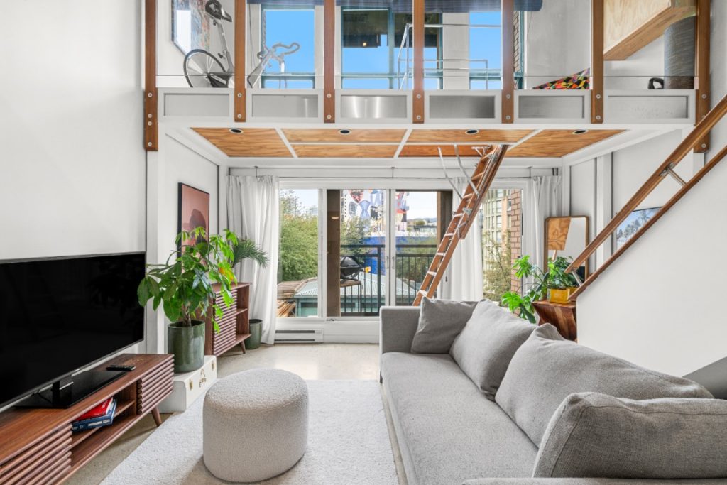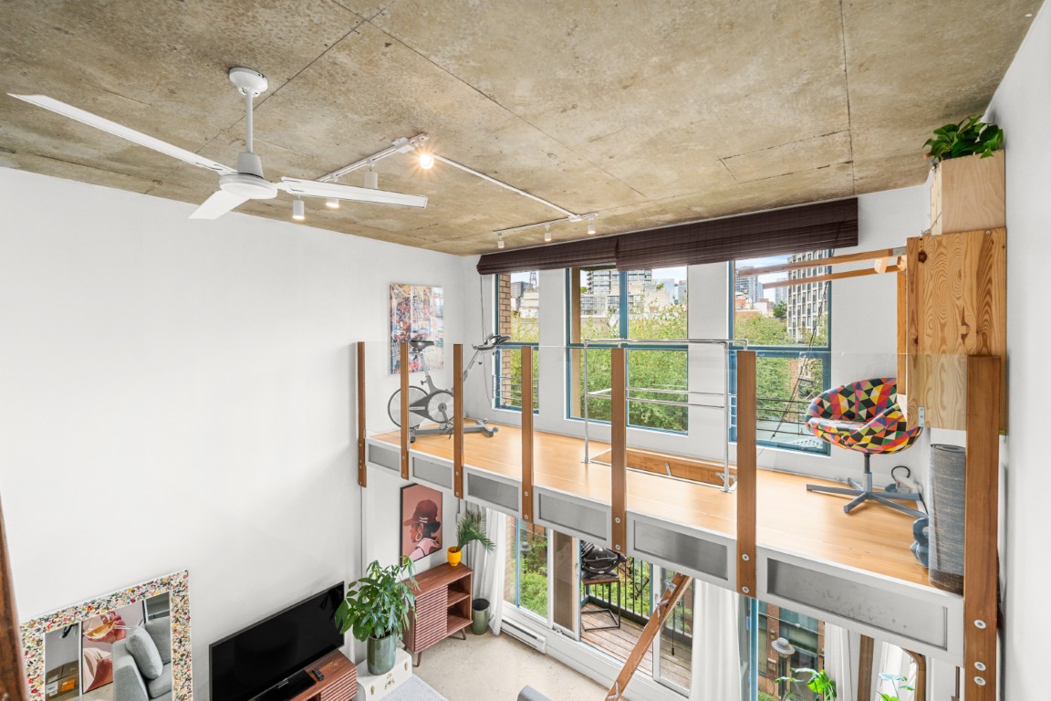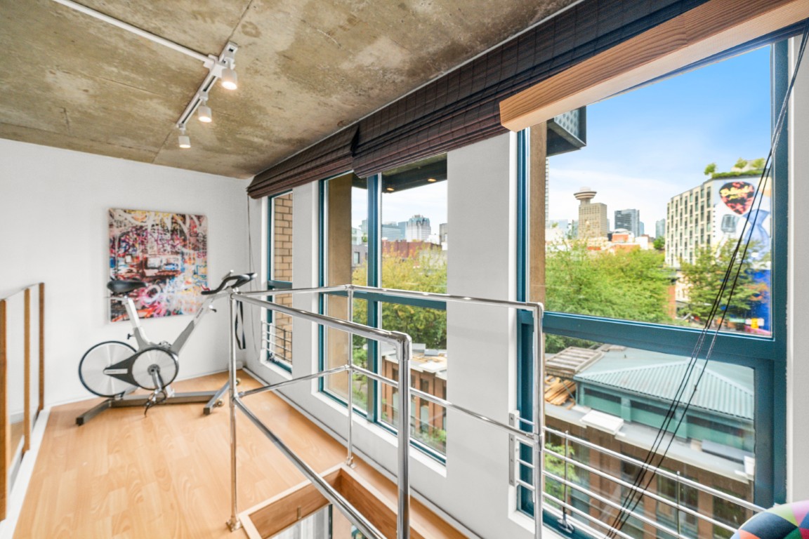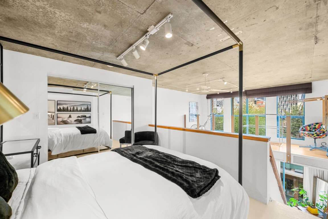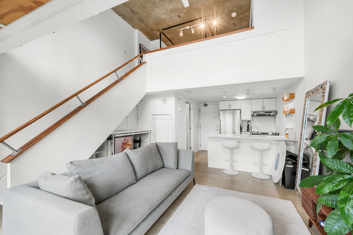 Welcome to the iconic Van Horne Lofts in Gastown! This fully furnished concrete loft offers soaring 16 ft. ceilings and double-height windows, showcasing beautiful Northwest city views of Harbour Centre and the North Shore Mountains. The spacious open layout includes a secondary loft/office space with a drop-down staircase, perfect for working from home. Features include hardwood and concrete floors, built-in storage/closet space, stainless steel railings, and the convenience of in-suite laundry. Enjoy your morning coffee or evening glass of wine on the balcony with stunning views. One secured underground parking stall is included. Located in the heart of historic Gastown, you’ll be steps away from Vancouver’s trendiest restaurants, cafes, and bars.