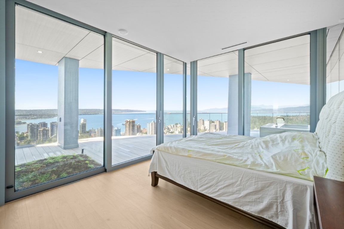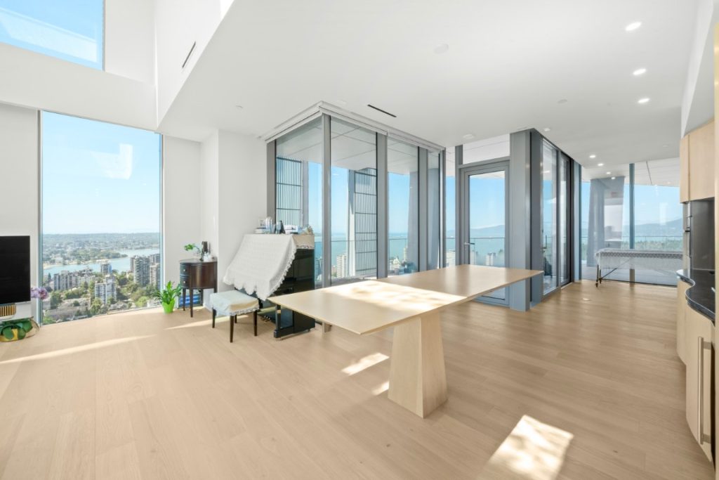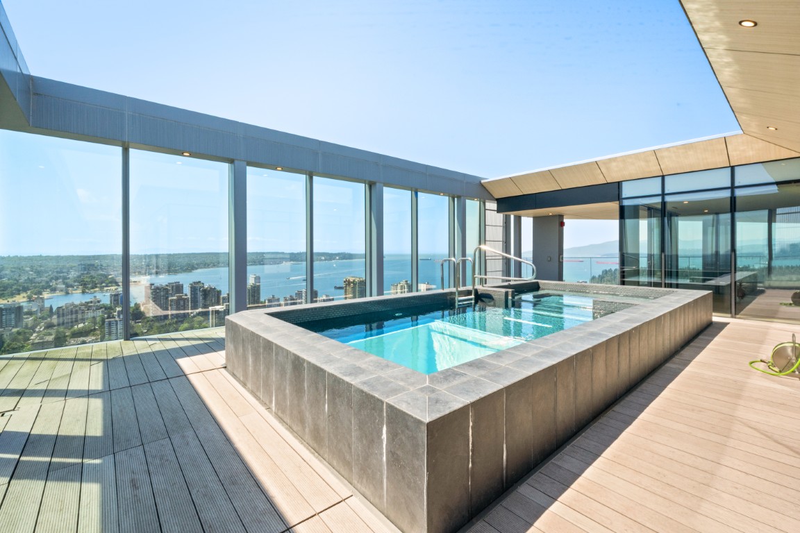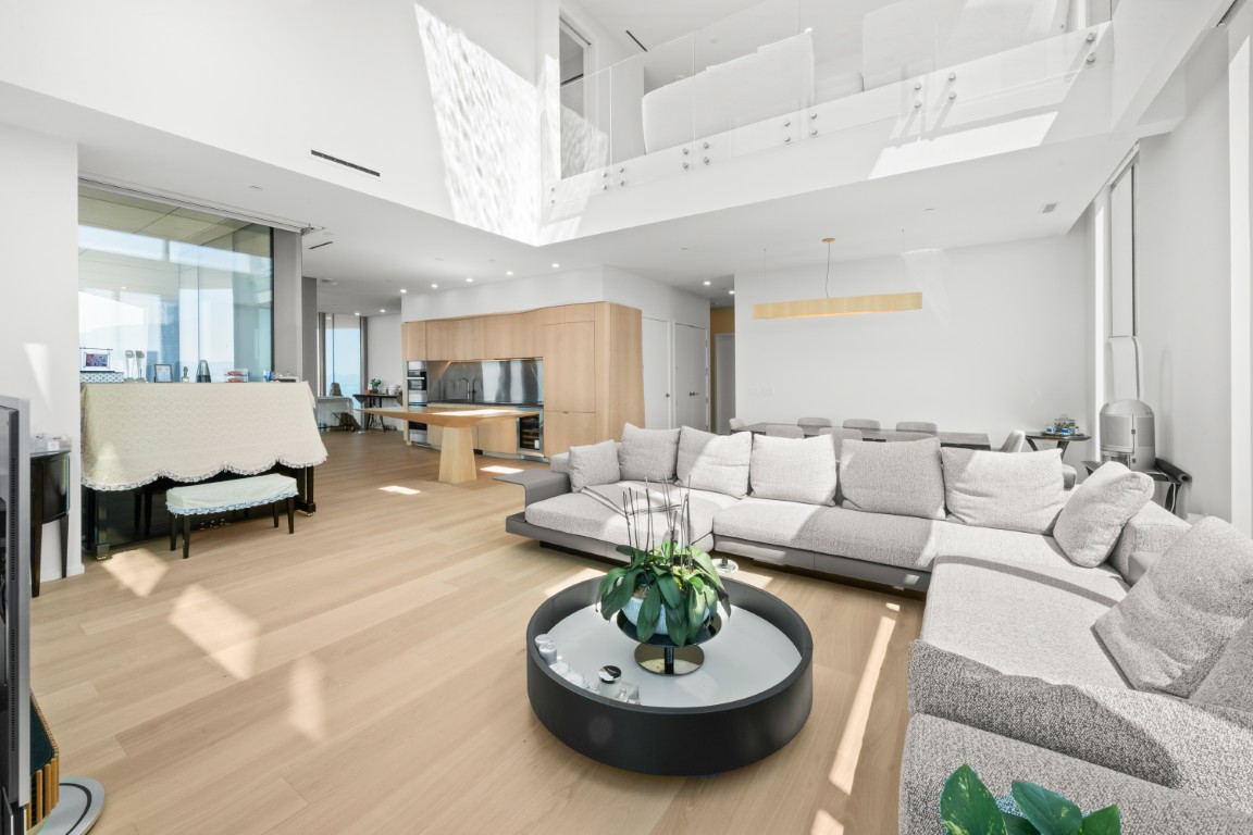 Experience the crown jewel of Alberni by world-renowned architect Kengo Kuma. This extraordinary skyhome is bathed in natural light, offering breathtaking panoramic views of Coal Harbour, the North Shore Mountains, and English Bay. The expansive living and dining area, with soaring 20-foot ceilings, sparkles with reflections from the private glass-bottom swimming pool and spa above. A dramatic open staircase clad in bleached white oak, or the private glass elevator, leads to three expansive outdoor terraces totaling over 2,200 square feet. The primary bedroom is a sanctuary with its own outdoor soaker tub, while residents enjoy the prestige of four private wine lockers, and access to world-class amenities with 24/7 concierge service.